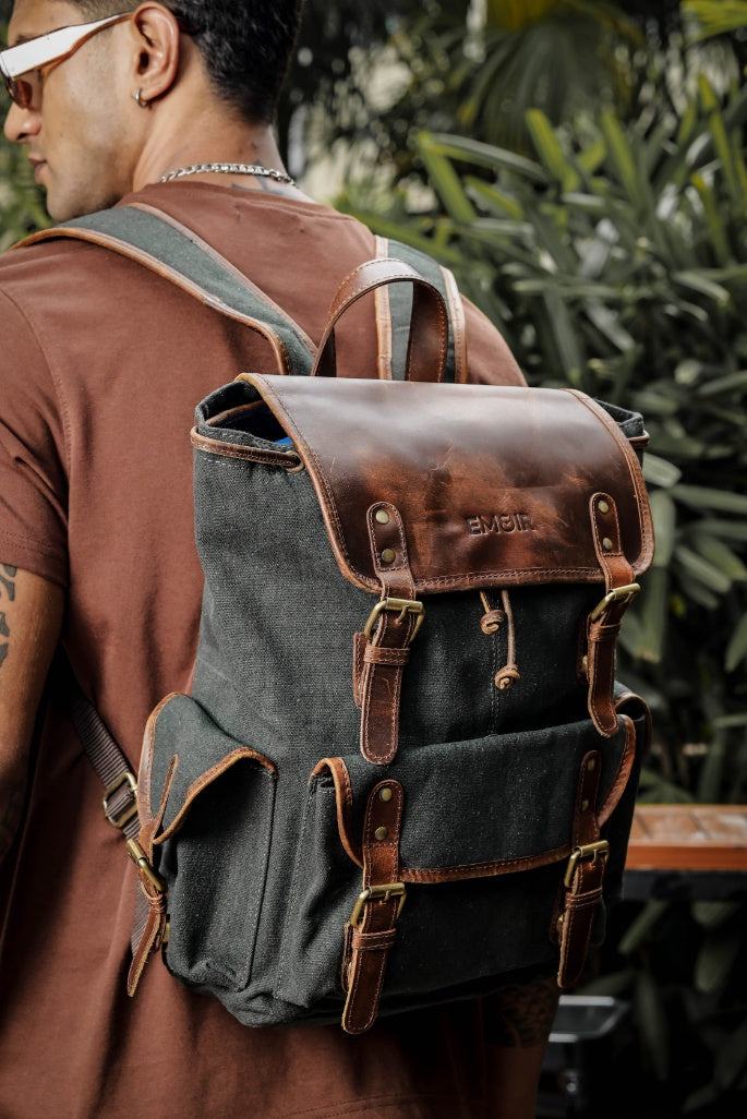 A durable laptop backpack made with heavy-duty emerald green canvas and genuine leather straps. Fits a 14” laptop, books, and daily essentials. Ideal for work, travel, or casual use. Unisex design with adjustable straps and padded back for comfort.