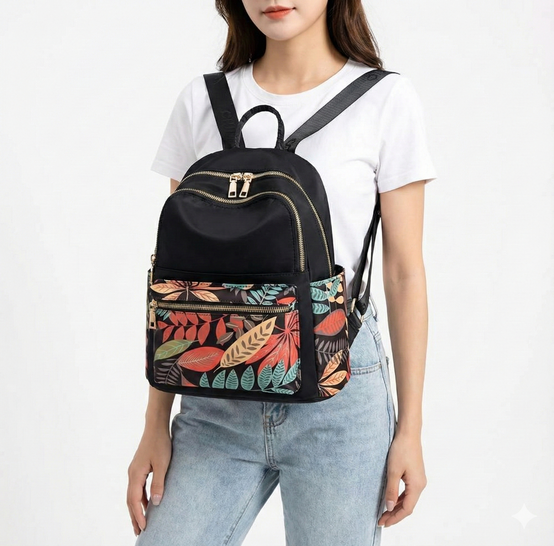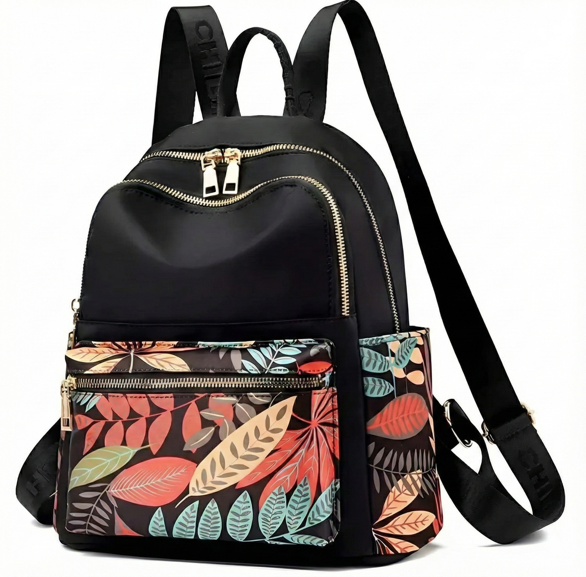 Floral printed backpack which combines everyday comfort with a bold, leaf-pattern design. The main body is sleek and solid-colored, while the front pockets add a pop of color with their detailed print. It has roomy compartments, smooth zippers, and adjustable straps for easy daily use. Ideal for college, casual outings, or city errands, it’s light to carry and stylish without trying too hard.