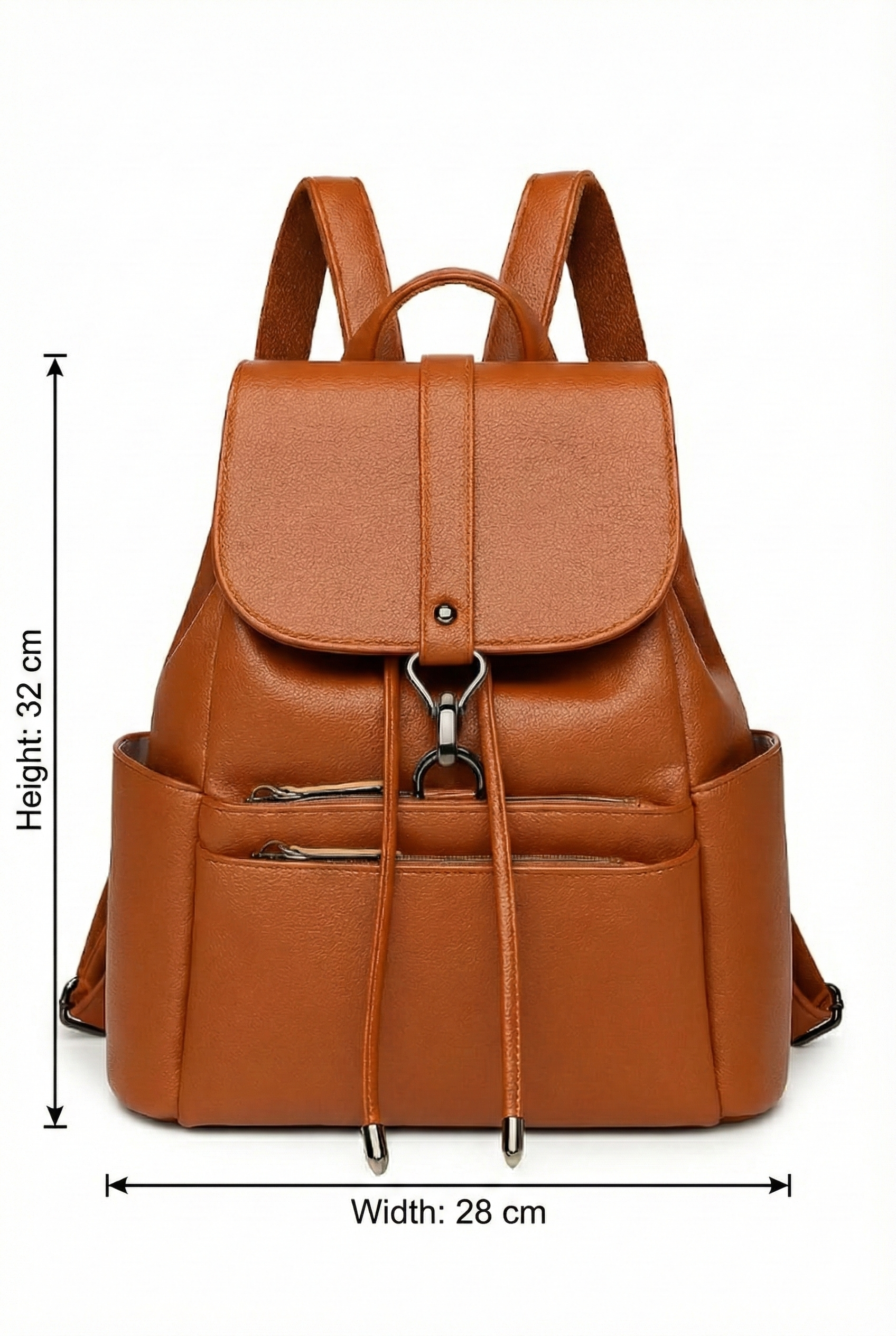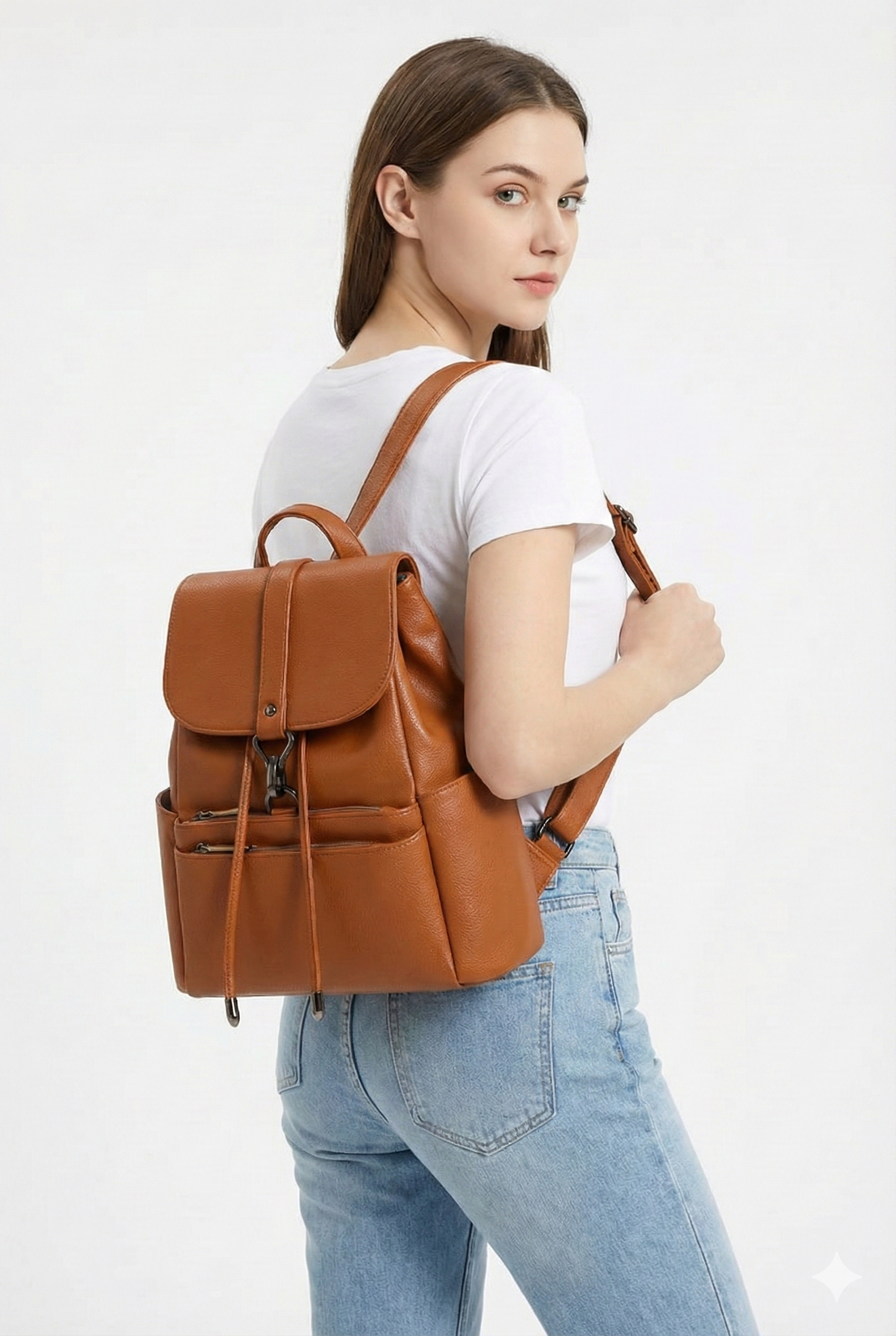 Brown leather backpack designed for the modern girl on the go. Crafted from durable faux leather in a rich brown shade, it combines casual elegance with practical functionality.